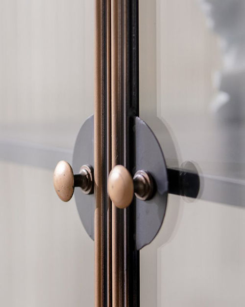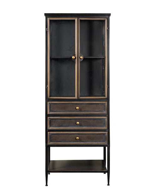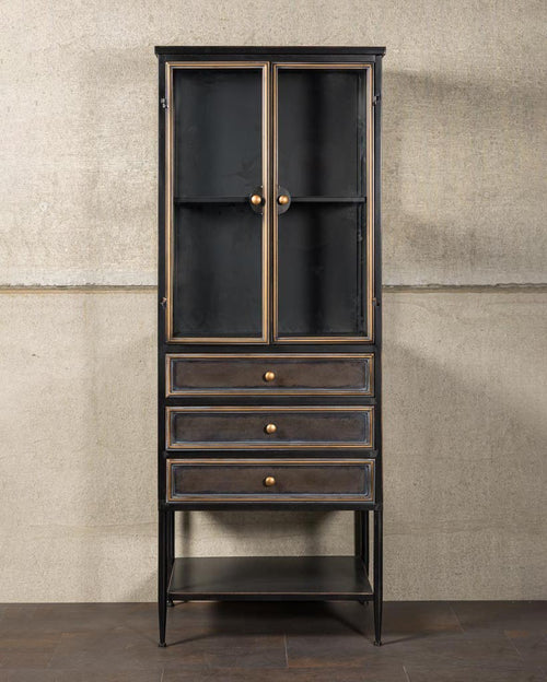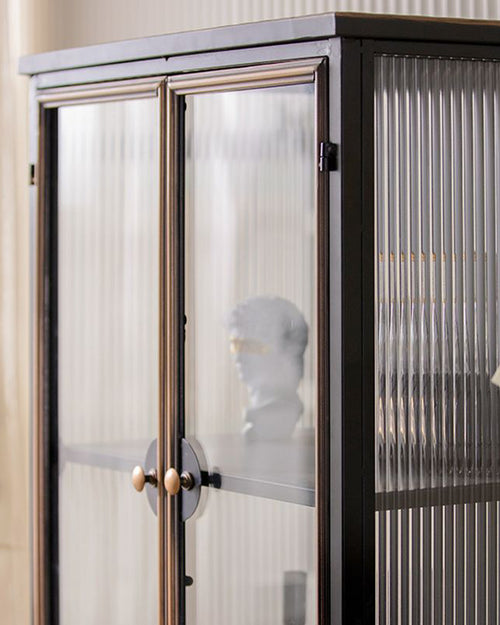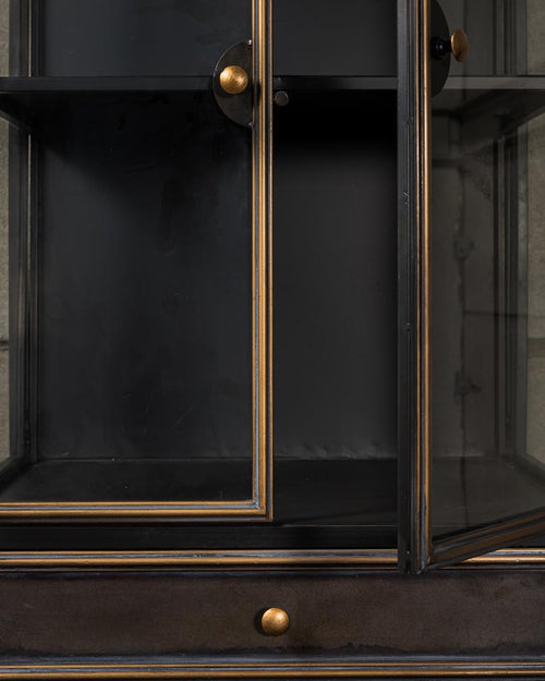 Suspended from the floor on a sturdy matte black iron frame, the Roane cabinet has been crafted by hand and features a double glass window opening.