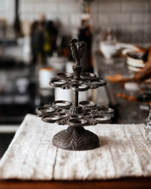 Organize and showcase your eggs on this rustic cast iron rooster egg display.