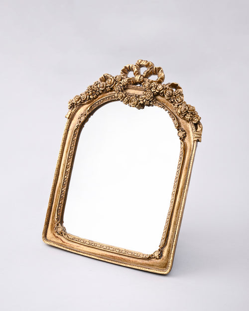 The Royal Bloom Vanity Mirror showcases a rectangular frame with soft rounded edges, adorned with intricate floral carvings and a delicate ribbon crest at the top. Finished in antique gold, it exudes a luxurious vintage charm, making it perfect for vanity tables or elegant home décor.