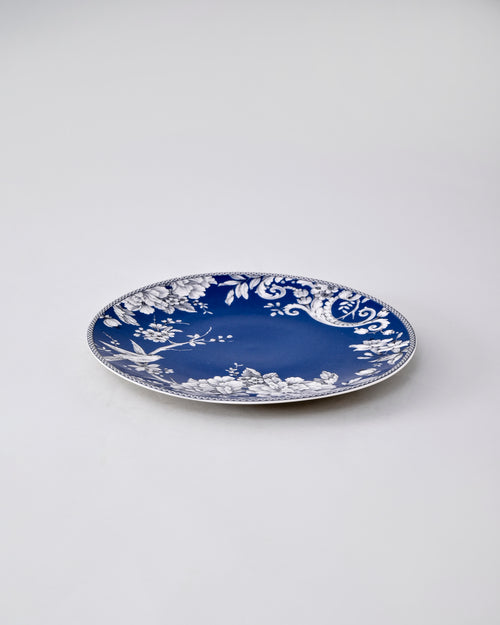 An elegant dinner plate crafted in a unique shape, featuring a rich royal blue base adorned with intricate white floral and bird motifs. The delicate detailing around the edges enhances its charm, making it perfect for serving starters, desserts, or side dishes.