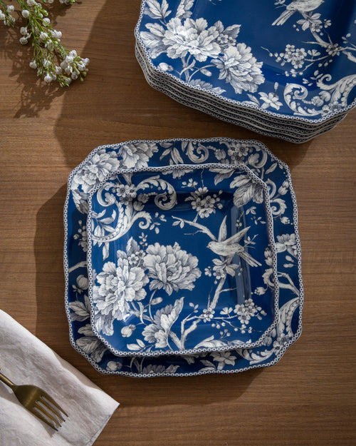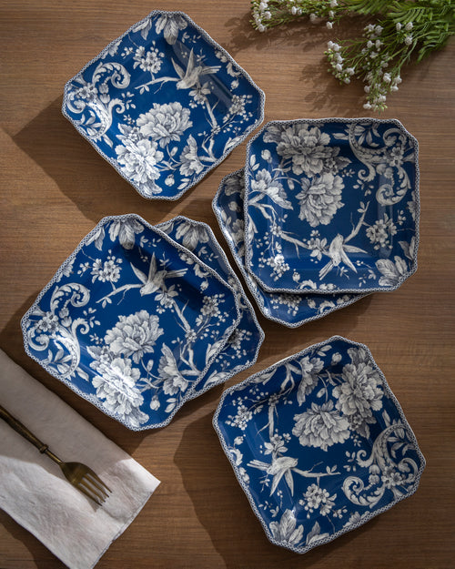 An elegant quarter plate crafted in a unique square shape, featuring a rich royal blue base adorned with intricate white floral and bird motifs. The delicate detailing around the edges enhances its charm, making it perfect for serving starters, desserts, or side dishes.