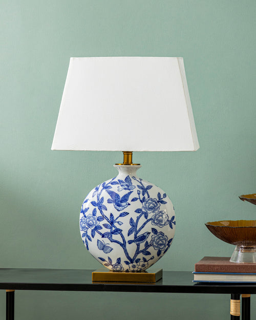 The Royal Blue Garden Table Lamp comes with a round white ceramic base that is intricately designed with blue floral and butterfly patterns, reminiscent of classic artistic designs. The design patterns are striking against the smooth glossy background, with the gold finish on the neck and square base giving it a sophisticated look.