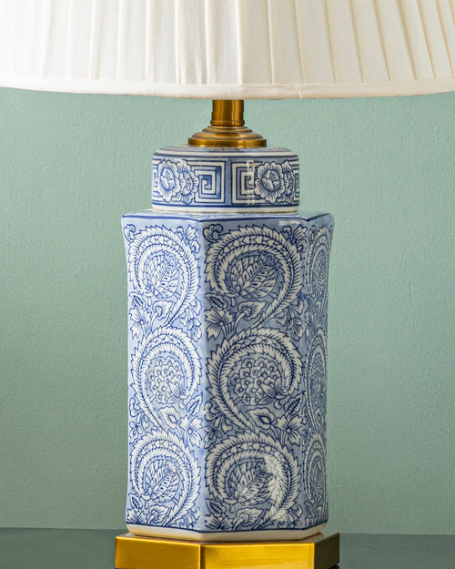 The lamp is made of ceramic and has a blue paisley and geometric design. It is a perfect addition to any living room, bedroom, or office.