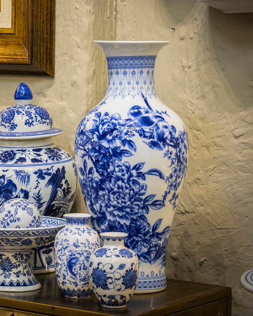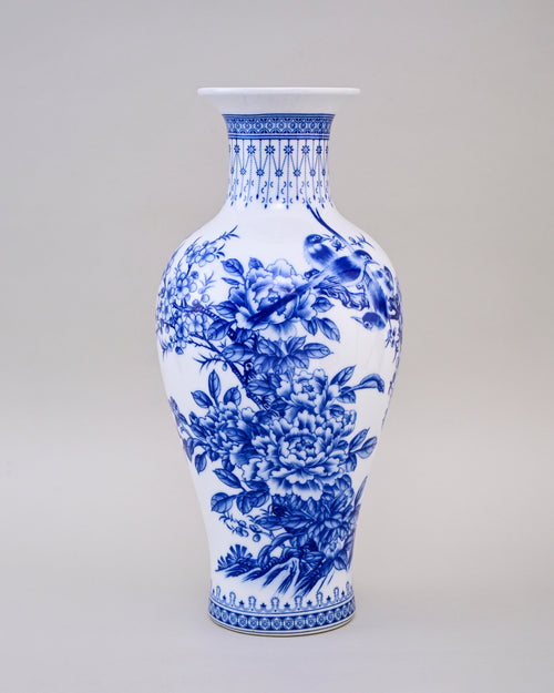 This elegant blue and white Bone China vase features intricate floral and bird motifs, showcasing timeless traditional artistry with a stylish touch. Its glossy finish and detailed hand-painted design make it a perfect centerpiece for any living room, dining space, or office.