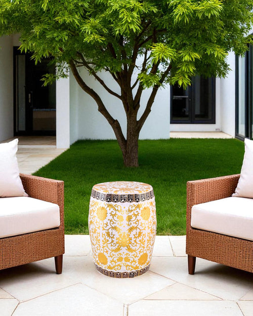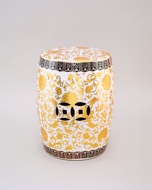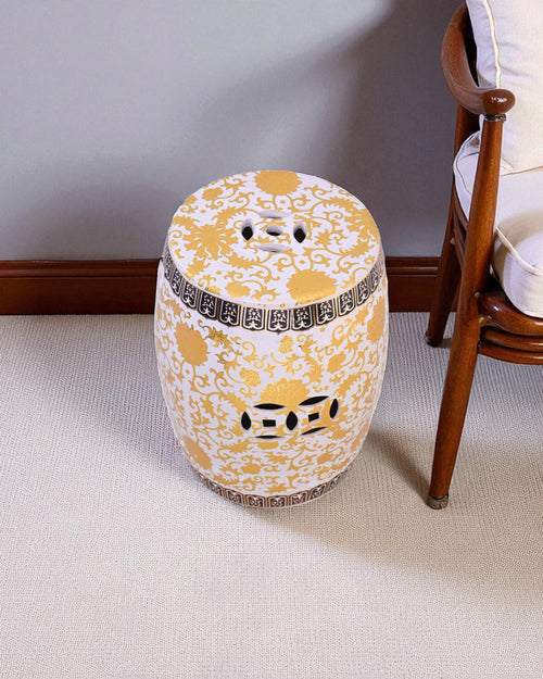 Elevate your home décor with this Royal Gold Floral Garden Stool, crafted with intricate golden floral patterns on a pristine white base. The elegant design and glossy finish make it a perfect accent piece for both indoor and outdoor spaces.
