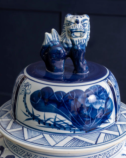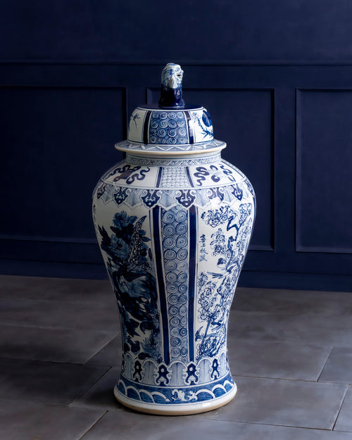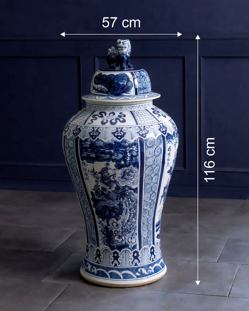 The structured silhouette is enhanced by intricate borders and a classic guardian lid, giving it a refined, architectural presence. Its blue-on-white palette keeps the look timeless while allowing the detailing to stand out with quiet elegance.