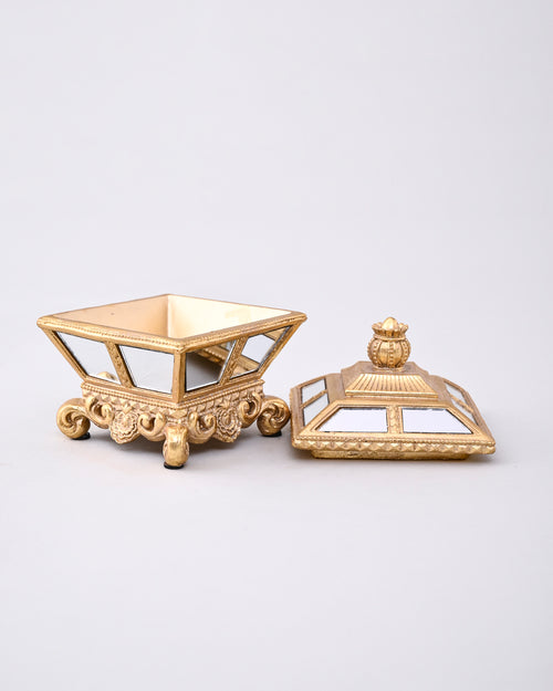 Perfect for storing rings, earrings, or keepsakes, it combines functionality with timeless elegance. The reflective surfaces enhance its luxurious charm, making it an exquisite vanity or tabletop accent that radiates royal sophistication.