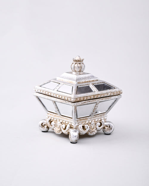 This Royal Mirror Treasure Jewelry Box embodies opulence with its geometric mirrored panels and antique silver finish. The box features an intricately carved floral base with ornate legs and a crown-shaped top, adding a regal touch to its design.