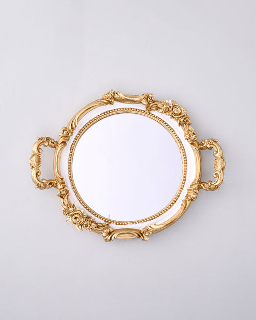 The Royal Petal Ornate Mirror Tray exudes timeless elegance with its intricately sculpted gold floral accents and antique-style handles. Its reflective mirrored base adds a touch of sophistication, perfect for serving, décor styling, or displaying perfumes and jewelry.
