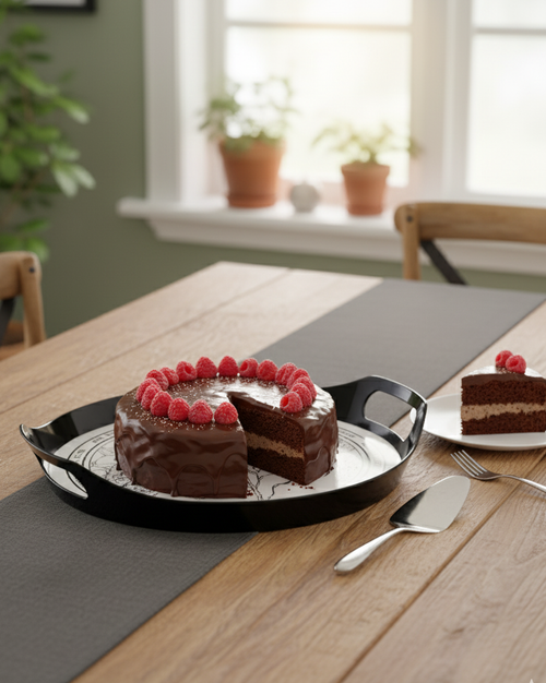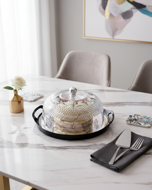 The sturdy black base provides a bold contrast, enhancing the overall regal look. Perfect for presenting cakes, pastries, and desserts, this stand not only keeps your treats fresh but also elevates their presentation with timeless sophistication. Ideal for special occasions, celebrations, or elegant everyday serving.