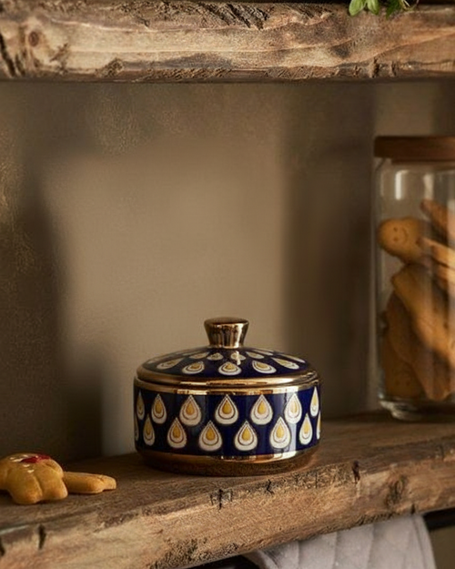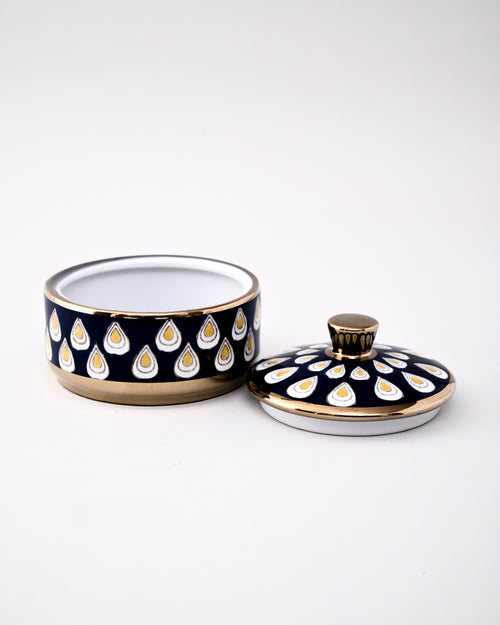 The Royal Raindrop Storage Jar showcases a stunning blend of modern luxury and traditional charm. Its deep navy blue base is beautifully adorned with gold and white teardrop motifs, giving it a peacock-feather-inspired elegance.