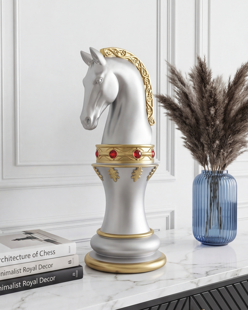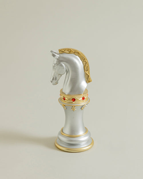 A majestic chess piece that resembles a royal kinght , this figurine is designed to be a stunning piece of décor. Created with grey and gold, this chess piece is a work of art that will bring elegance, grace, and power to any setting.