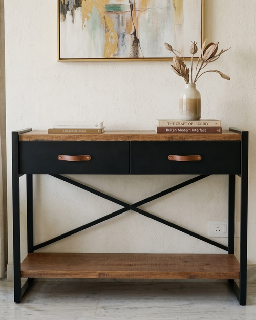 With two large storage drawers and a broad shelf space, this storage console table is perfect for keeping essentials, decorative items, books, or other objects in a neat and fashionable manner.