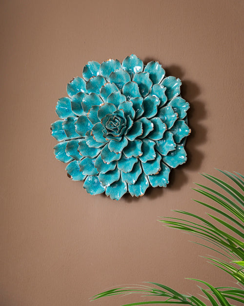 These are wall-mounted succulent-inspired decor pieces, designed to resemble layered rosettes with intricate petal details. The turquoise color is accented with subtle gold or white edges, giving them a rustic yet elegant look. They evoke a nature-inspired, calming aesthetic, perfect for botanical or bohemian-themed interiors.