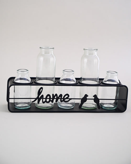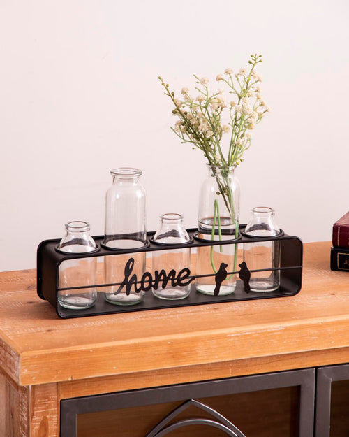 This decorative set features five clear glass vases of varying heights, elegantly displayed within a black metal frame. The frame is accented with the word "home" and two perched bird silhouettes, adding a charming rustic touch. Perfect for showcasing fresh flowers, dried arrangements, or decorative accents, this piece is ideal for tabletops, shelves, or mantel displays.
