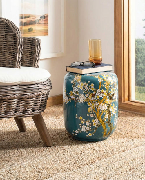 Enhance your home décor with this Mint Blossom Elegance Garden Stool, featuring a refreshing teal green glaze adorned with exquisite hand-painted white blossoms and golden accents. The intricate floral detailing combined with a glossy finish brings a luxurious and artistic touch to any setting.