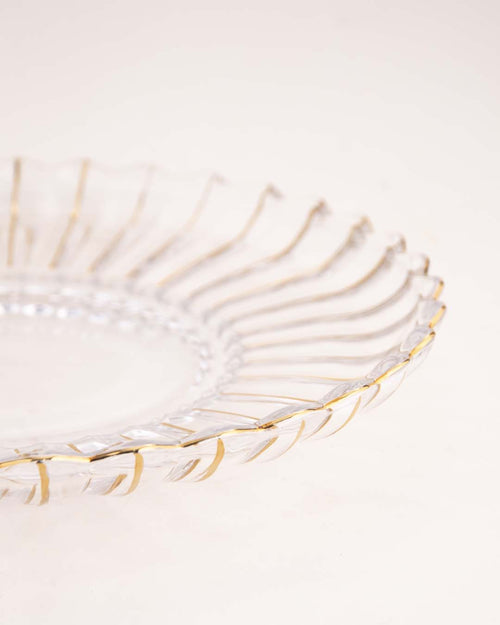 This type of Glass Plate is typically used for Decorative Purposes, But it can also serve Functional Roles, such as Holding Fruits, Desserts, or other items During special occasions. The Gold accents and intricate Design Make it a standout Piece suitable For Display in a Formal Dining Room or living area.