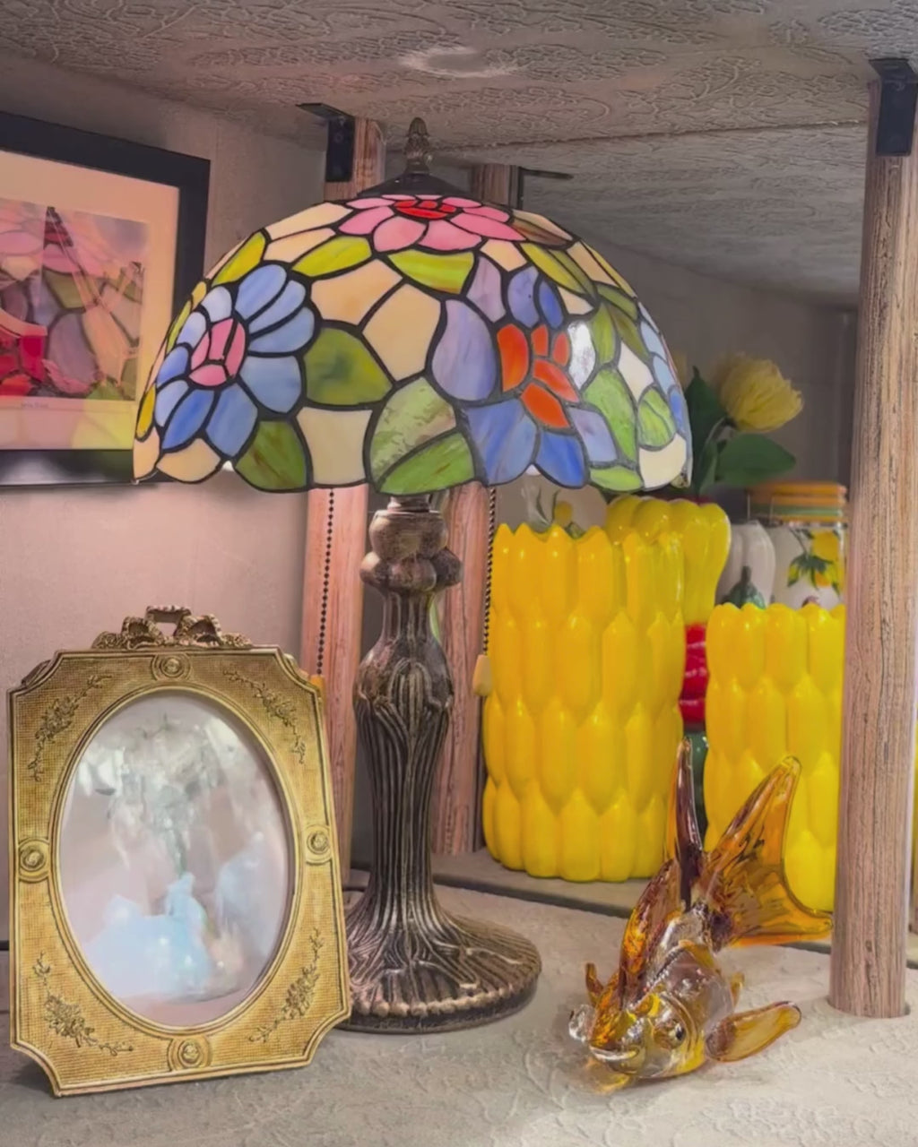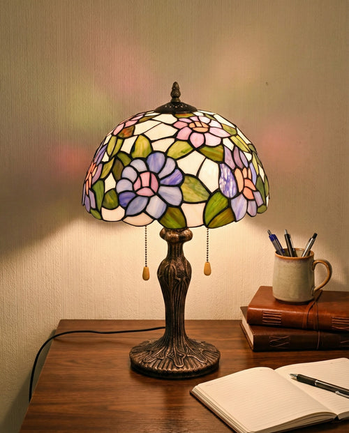 A Tiffany lamp is a type of lamp with a glass lampshade that is made of intricately cut stained glass pieces and illustrates floral and other elegant patterns.