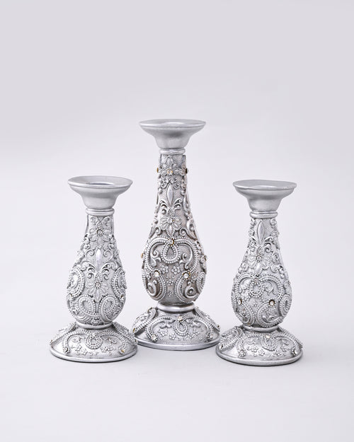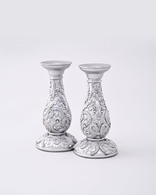 This Silver Ornate Floral Candle Stand showcases exquisite craftsmanship with its intricate embossed floral and swirl patterns. The elegant teardrop-shaped body and antique silver finish give it a luxurious, vintage charm.