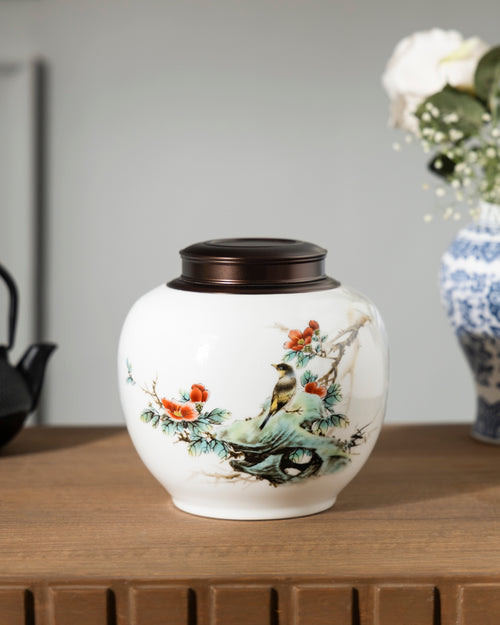 Elevate your home décor with the Snow Finch Hand-Painted Ceramic Storage Jar, featuring delicate bird and branch artwork on a pristine white base. Its classic oriental painting style gives it a timeless charm, making it perfect for storing tea,