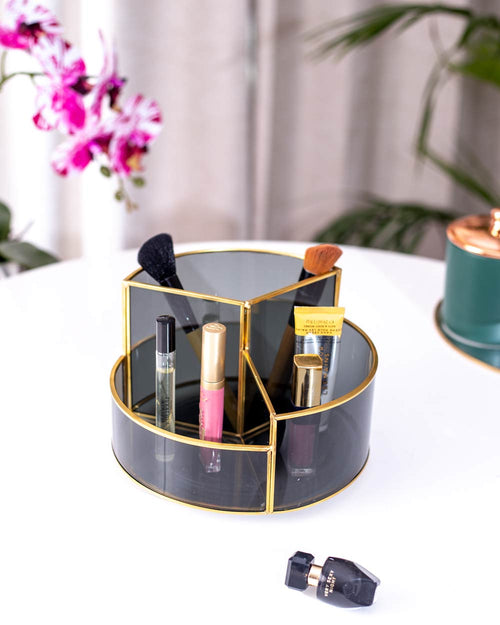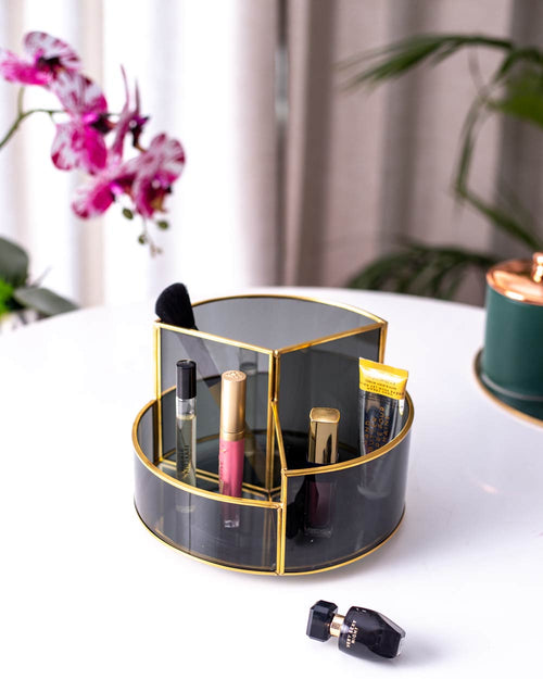 Your makeup isn't meant to be hidden in the depths of your drawers! Show it off with this Glass and Metal Vanity organizer and keep your beauty essentials at hand. It features four organizational compartments and is all you need to keep your vanity clean and free from clutter. Made of glass, this organizer features brilliant gold highlights and is a perfect balance of beauty and function.