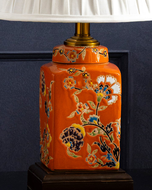 The Sunset Blossom Ceramic Table Lamp features a vibrant orange ceramic base decorated with elegant floral patterns that add warmth and artistic charm. Finished with a pleated ivory shade and brass mount, it creates a cozy glow perfect for living rooms or bedside settings.