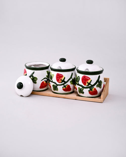 This Sweet Strawberry Condiment Server With Spoon is a charming addition to any kitchen. Made with high-quality ceramic, it features design and comes with a matching spoon. Perfect for storing and serving your favourite condiments or spices with a touch of country charm.