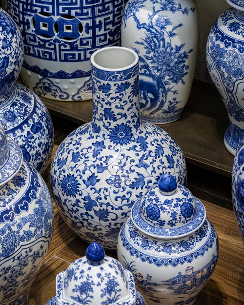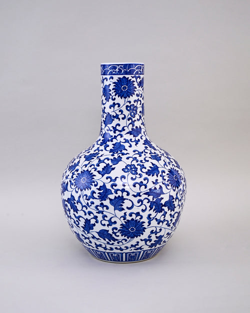 This vase is a classic example of blue and white porcelain artistry. It features intricate floral motifs and swirling vine patterns painted in cobalt blue on a white ceramic base. The bulbous body gracefully transitions into a tall neck, creating a balanced and elegant silhouette. The floral and foliage designs symbolize beauty, harmony, and timeless craftsmanship, making it a perfect decorative piece for both traditional and modern interiors.