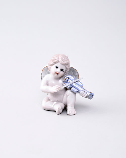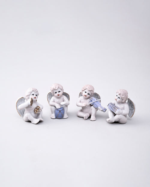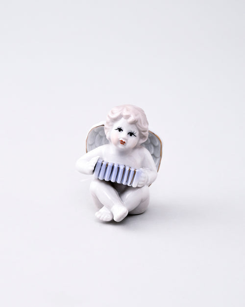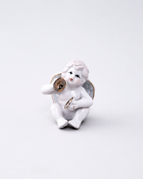 A delightful pair of porcelain cherubs capturing the innocence and joy of heavenly music. Each cherub sits gracefully atop a soft cloud, holding a golden instrument that symbolizes peace and divine melody.