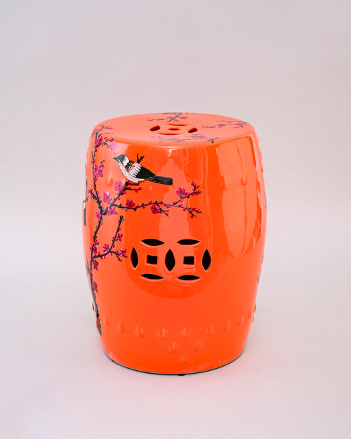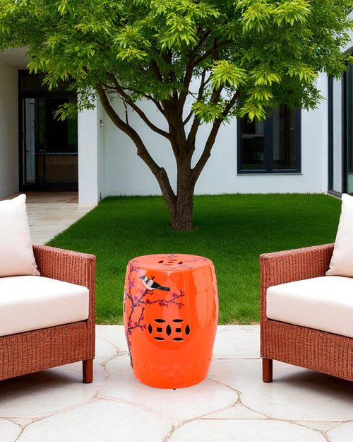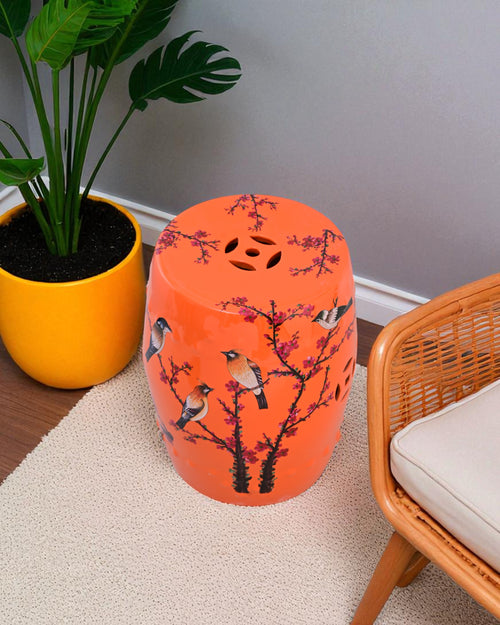 Bring vibrant charm to your home with this Tangerine Blossom Bird Ceramic Garden Stool, beautifully designed with a lively orange glaze and hand-painted birds perched on blooming branches. The striking colors and intricate detailing make it a stunning decorative accent for any space.