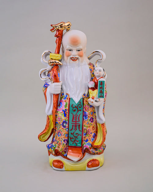 The long-bearded old sage is the God of longevity, Shou. He is always seen with a peach in his hand which is a symbol of longevity in Chinese mythology.