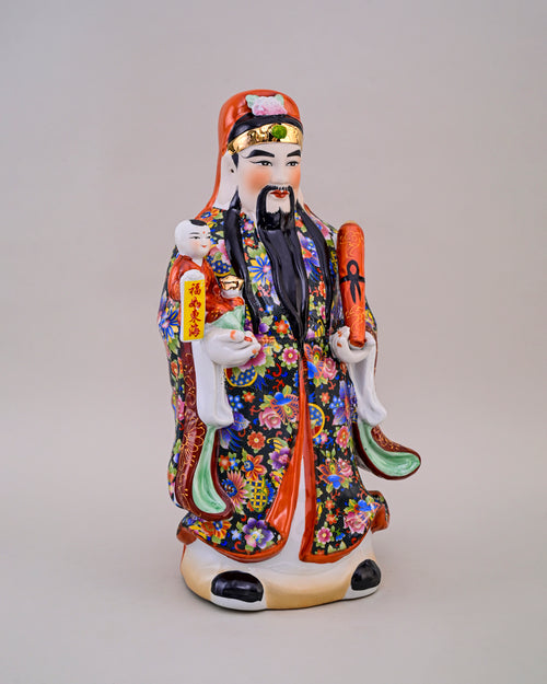 Wearing a hat of a high official in the emperor's court, the God Lu represents good fortune. As a society based on Confucius's scholar-statesman philosophy, the way to acquire good fortune was first to receive a good education and then to become a high-rank official. He is always in the centre of these three.