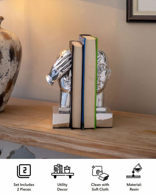 The beautiful statue is made of silver-colored resin with pedestal. These bookends are available in four variants. Keep your books and magazine organize with this beautifully crafted and functional bookends. This pair of durable bookends can act as focal point pieces for the living room, the office, home libraries, and study area/desks. Elegant bookends keep vertical stacks of books from falling over, and tidy up desks and accent tables. Designed with felt or rubber stoppers at the base that prevent scratching furniture and table tops, as well as sliding around.