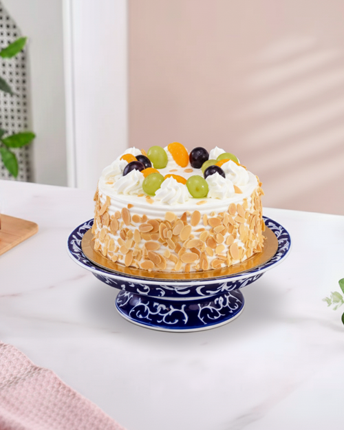 This elegant blue and white floral cake stand adds a touch of royalty and charm to your dining table. Crafted with intricate traditional designs, it enhances the beauty of cakes, pastries, and desserts when displayed.