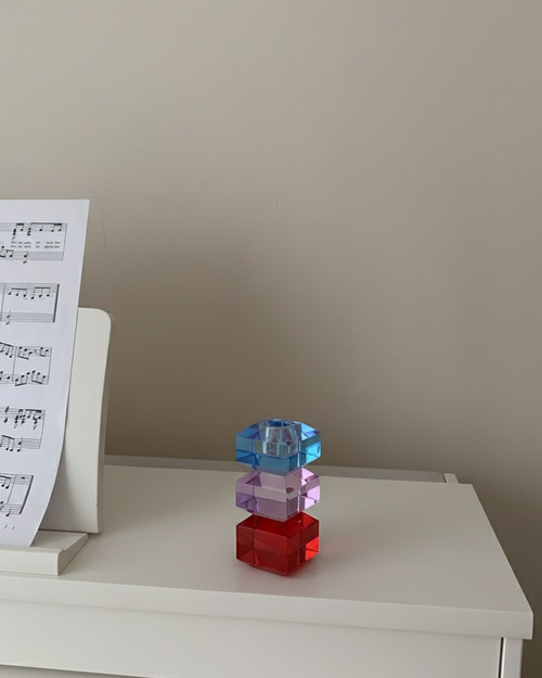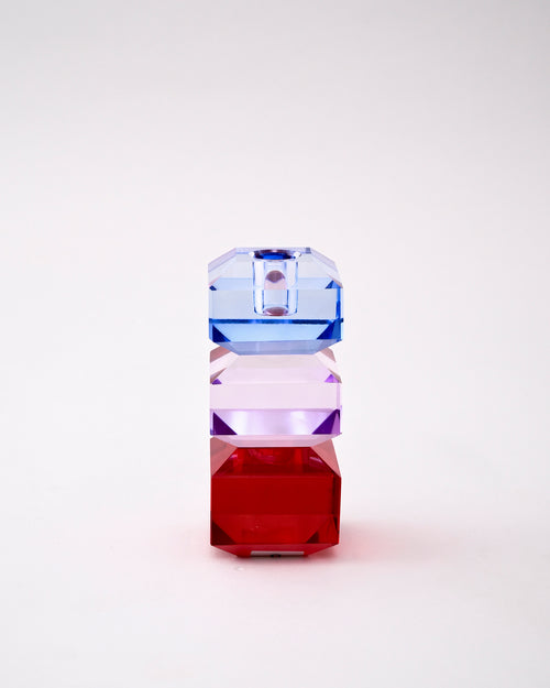 This elegant crystal candle stand features a striking trio of geometric blocks in vibrant red, lavender, and blue hues. Its stacked prism design beautifully refracts light, creating a mesmerizing play of color and reflection.