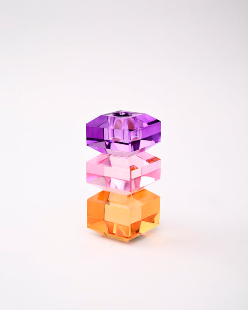 This elegant crystal candle stand features a striking trio of geometric blocks in vibrant pink, lavender, and brown hues. Its stacked prism design beautifully refracts light, creating a mesmerizing play of color and reflection.