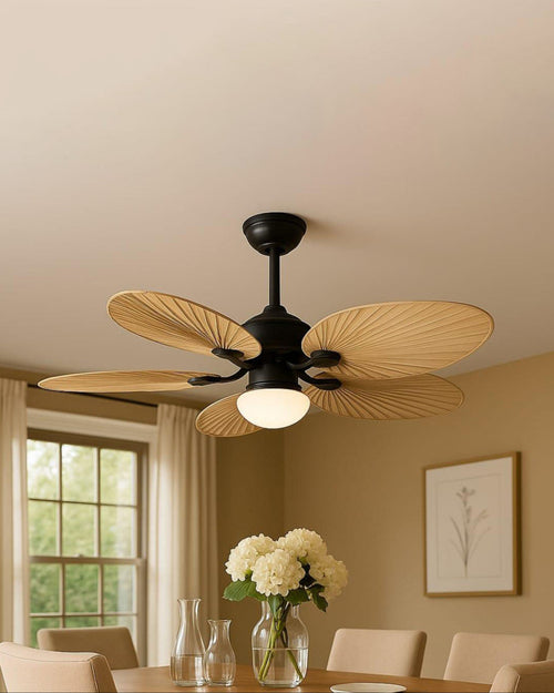 Bring a relaxing, resort-style ambiance to your space with the Tropi Breeze Palm Leaf LED Ceiling Fan Light. Designed with five beautifully curved blades mimicking natural palm leaves, this fan adds an organic yet elegant aesthetic to living rooms, patios, or coastal-themed bedrooms. The integrated central light fixture emits a warm, soft glow, perfect for ambient lighting. Finished in a soft beige and white tone, it blends seamlessly into airy, nature-inspired interiors. Quiet operation and remote control compatibility make it both stylish and functional.