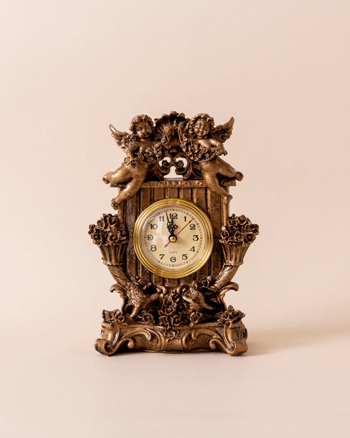 Bring timeless elegance to your space with this twin cherub antique table clock. Adorned with beautifully detailed cherub figures and intricate floral accents, it boasts a luxurious bronze finish. The classic Roman numeral clock face enhances its vintage charm, making it a stunning decorative piece for mantels, shelves, or side tables.