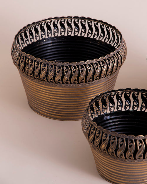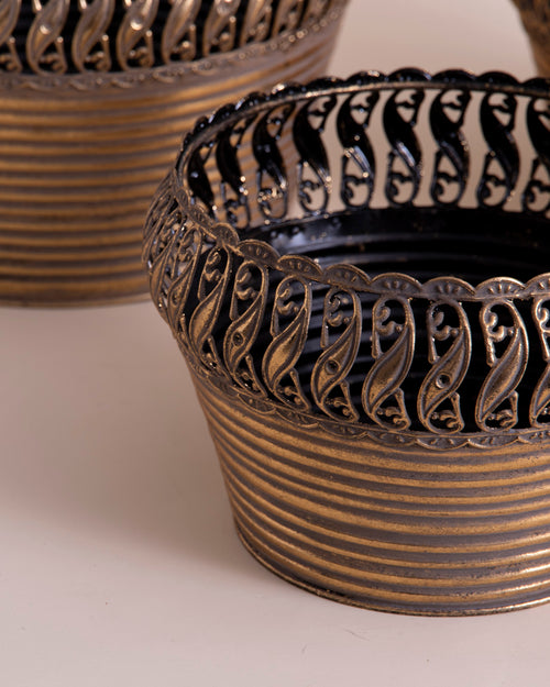 These embossed metal planters combine artistry with durability. The antique tone and intricate floral motifs add sophistication to any room or garden. Their weathered metallic finish evokes timeless elegance, perfect for complementing both modern and vintage interiors