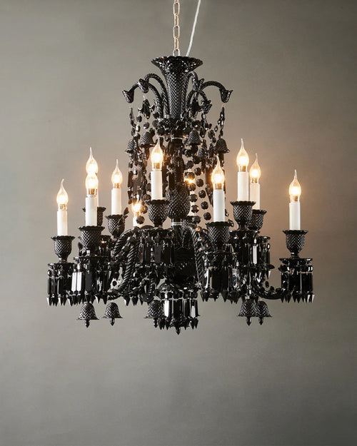 The chandelier appears to be a black crystal chandelier with a Gothic or Victorian-inspired design. It features multiple arms with candle-style lights, each adorned with black crystal drops and beads. The intricate detailing on the body, along with the dark color scheme, gives it a dramatic and luxurious appearance.