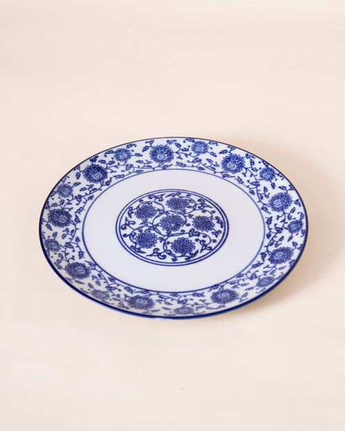 The vintage pattern of our glazed ceramic dinner plates is reminiscent of an antique original, featuring stately chrysanthemum and vine motifs. The pattern is printed in tonal shades of Blue that look especially stunning layered with other products in the same collection.