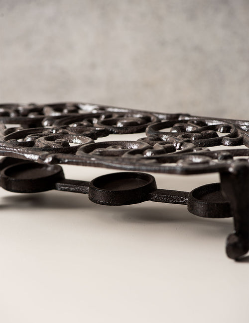 Entertain in style with our dish warming cast iron trivet. Made of sturdy cast iron with holders for 3 votive candles, it is both functional and decorative.