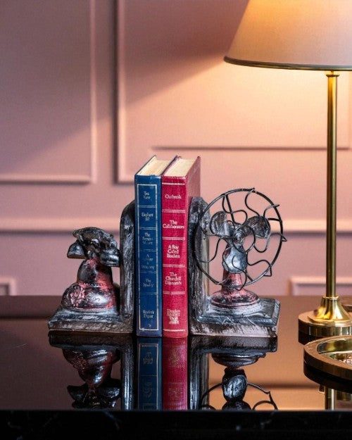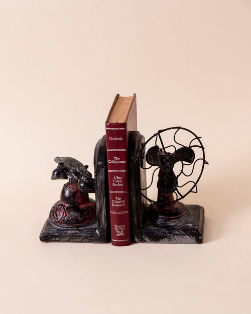 Display your love for vintage with these adorable bookends featuring a fan and phone design. Made from high-quality materials, they add a touch of nostalgia to any bookshelf or desk. The perfect gift for book lovers and vintage enthusiasts alike.