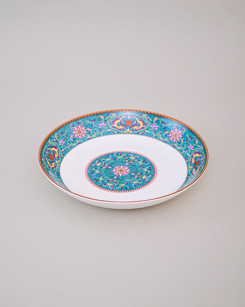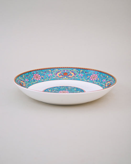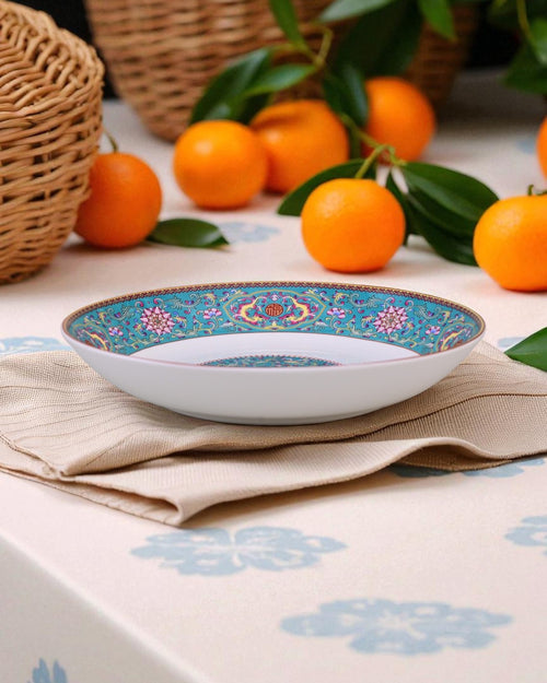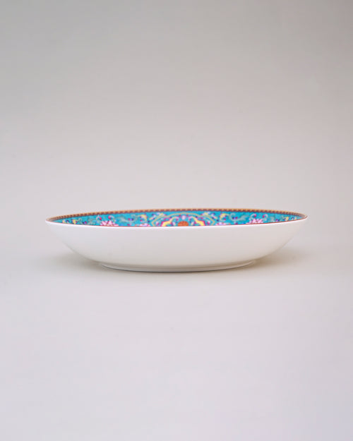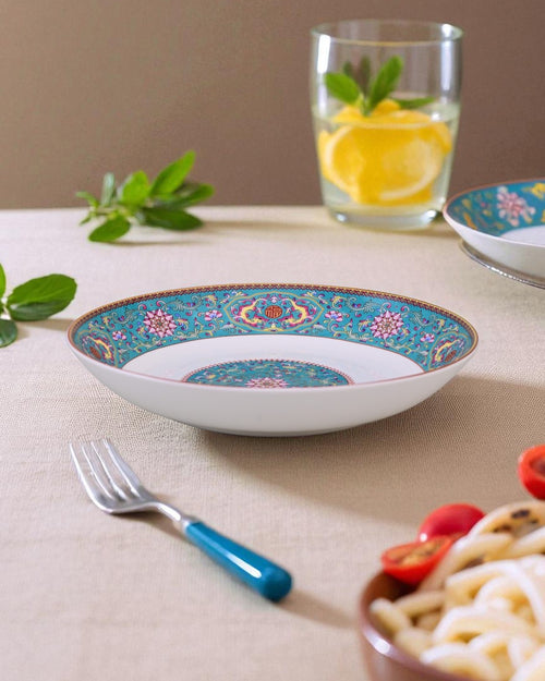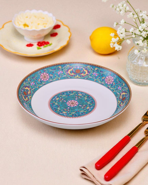 This beautifully designed pasta plate features intricate floral and ornamental motifs on a rich blue background, giving it a royal and elegant look. Its wide, shallow design makes it ideal for serving pasta, salads, rice, or continental dishes with style. Perfect for festive dining or everyday use, this plate brings a touch of tradition and sophistication to your tableware collection.