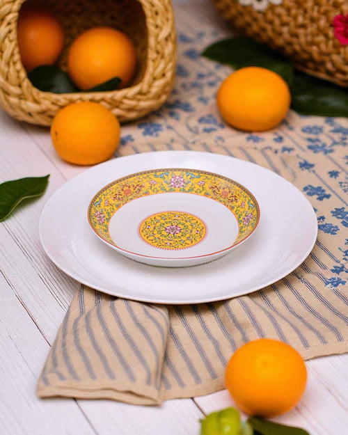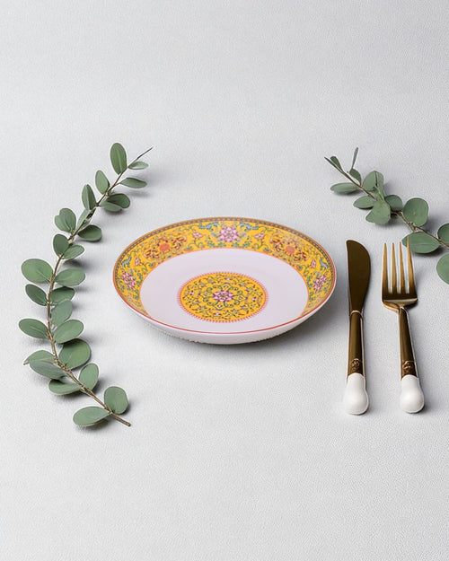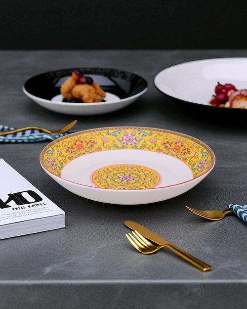 This beautifully designed pasta plate features intricate floral and ornamental motifs on a rich yellow background, giving it a royal and elegant look. Its wide, shallow design makes it ideal for serving pasta, salads, rice, or continental dishes with style. Perfect for festive dining or everyday use, this plate brings a touch of tradition and sophistication to your tableware collection.