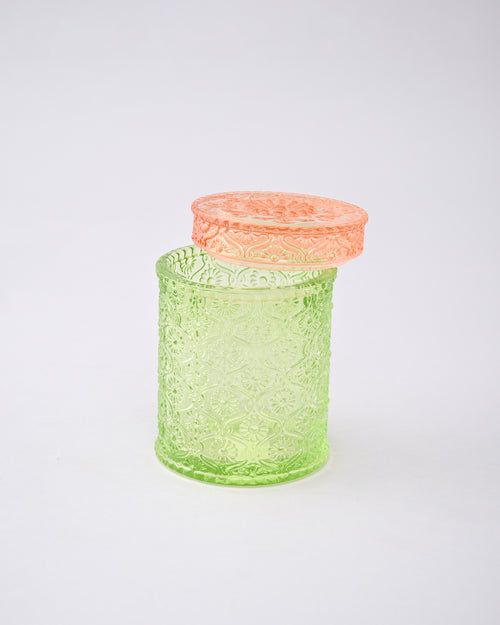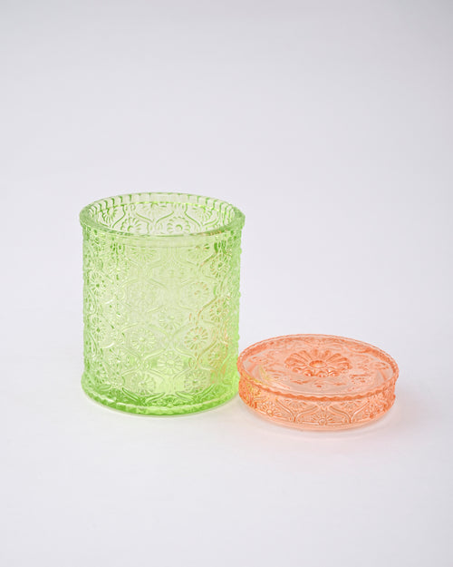 ThisVintage Floral Emerald Glass JarĀ features a charming blend of translucent green glass with a peach-toned lid, creating a refreshing and elegant contrast. The surface is beautifully decorated with intricate floral and geometric embossing, giving it a timeless, handcrafted appeal. Perfect for storing candies, dry fruits, or decorative items, this jar adds a touch of retro elegance and vibrant color to any kitchen, dining, or vanity space.