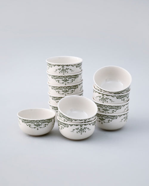 This elegant dinner set features a timeless vintage design with delicate green floral and leafy motifs on a crisp white base. Crafted from fine ceramic/porcelain, the set includes plates, bowls, cups, and serving platters, making it ideal for both everyday use and special gatherings.