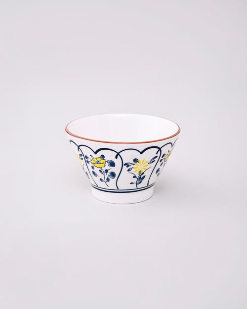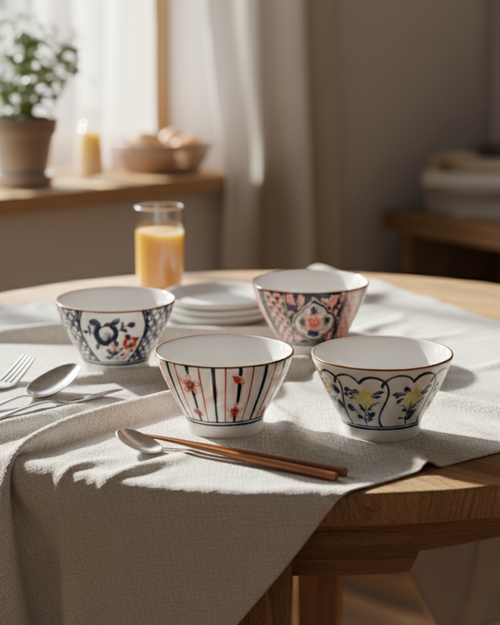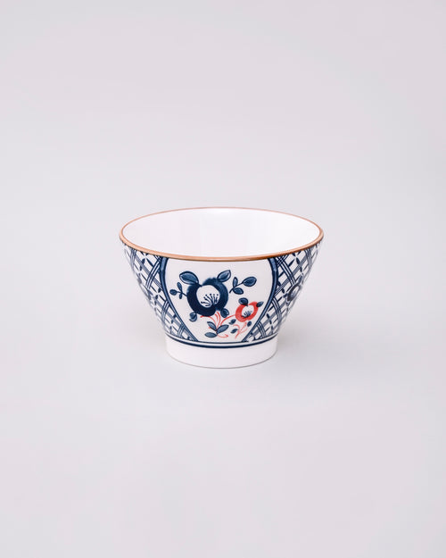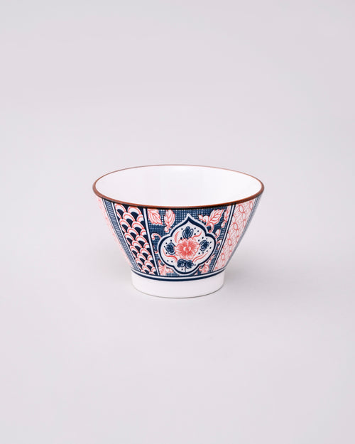 A beautifully crafted set of ceramic bowls featuring intricate vintage-inspired floral and geometric patterns in soft hues of navy, red, and yellow. Each bowl showcases a unique hand-painted design with delicate detailing and a refined contrast rim, adding elegance to your dining experience. Perfect for serving soups, snacks, or desserts, this set blends traditional artistry with modern sophistication.