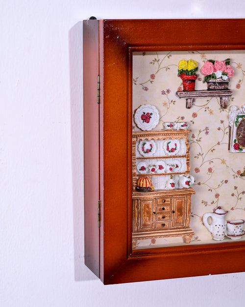 A beautifully crafted wooden key box designed like a miniature vintage kitchen scene. The box features intricate 3D details from tiny cabinets and crockery to floral décor all set against a delicate patterned backdrop. Its warm wooden frame and charming handcrafted accents make it both functional and decorative, perfect for keeping your keys organized while adding a nostalgic touch to your home décor.