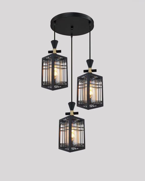 Elevate your space with the Lantern Pendant Light from the Vintage Oriental a stunning blend of classic charm and modern craftsmanship. This pendant light features three hanging lantern-style lamps, each enclosed in a black metal frame with intricate geometric lattice patterns reminiscent of traditional Asian design motifs.